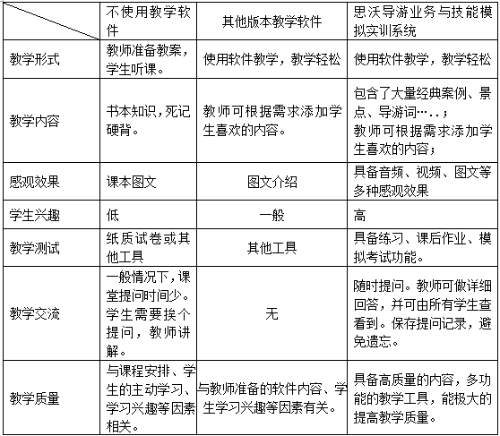 在本(ben)教(jiao)學(xue)(xue)軟(ruan)件(jian)中,囊括了幾乎所(suo)有導游所(suo)需要的各(ge)種信(xin)息(xi),這種信(xin)息(xi)量可(ke)(ke)以說是(shi)海納百川,是(shi)一個(ge)龐(pang)大的數(shu)據庫。學(xue)(xue)校使用這個(ge)數(shu)據庫不但(dan)可(ke)(ke)以提(ti)供為教(jiao)師上課使用,還可(ke)(ke)以成為學(xue)(xue)生(sheng)的電子閱覽書庫,例如在“景點視頻”模(mo)塊中有包(bao)含國內(nei)外大量著名景點的視頻介(jie)紹,生(sheng)動有趣。其中許(xu)多內(nei)容(rong),包(bao)括天(tian)文地理、人文經(jing)濟、法律(lv)法規、禮(li)儀(yi)儀(yi)態等(deng),將不單單滿足旅游專業的學(xue)(xue)生(sheng),還可(ke)(ke)以提(ti)供給非旅游專業的學(xue)(xue)生(sheng)大量、豐富的文化知識。
