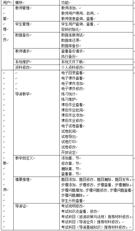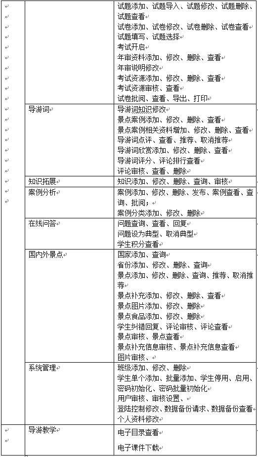 教師主要功能(neng)包括班(ban)級學(xue)生管(guan)理(li)(li)、導(dao)游(you)(you)基礎知(zhi)識管(guan)理(li)(li)、國內導(dao)游(you)(you)知(zhi)識管(guan)理(li)(li)、國外(wai)導(dao)游(you)(you)知(zhi)識管(guan)理(li)(li)、情景(jing)題目管(guan)理(li)(li)、導(dao)游(you)(you)證考試(shi)(shi)資(zi)料管(guan)理(li)(li)、模擬考試(shi)(shi)、導(dao)游(you)(you)詞(ci)管(guan)理(li)(li)、導(dao)游(you)(you)案例管(guan)理(li)(li)、知(zhi)識拓展、案例分析管(guan)理(li)(li)、在(zai)線問答、國內外(wai)景(jing)點信息管(guan)理(li)(li)等。