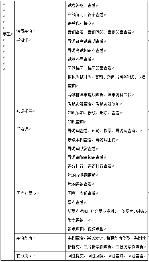學(xue)生的(de)(de)(de)主要功能是導游(you)教學(xue)知(zhi)識(shi)的(de)(de)(de)學(xue)習、完成情景(jing)推理中包含(han)的(de)(de)(de)案例及(ji)題目、導游(you)證考(kao)試(shi)學(xue)習及(ji)模擬考(kao)試(shi)、導游(you)拓展知(zhi)識(shi)學(xue)習,同時可添加新(xin)的(de)(de)(de)知(zhi)識(shi)供其他同學(xue)學(xue)習、導游(you)詞(ci)學(xue)習并編寫導游(you)詞(ci)、國內外景(jing)點學(xue)習、案例分(fen)析和在線提(ti)問。