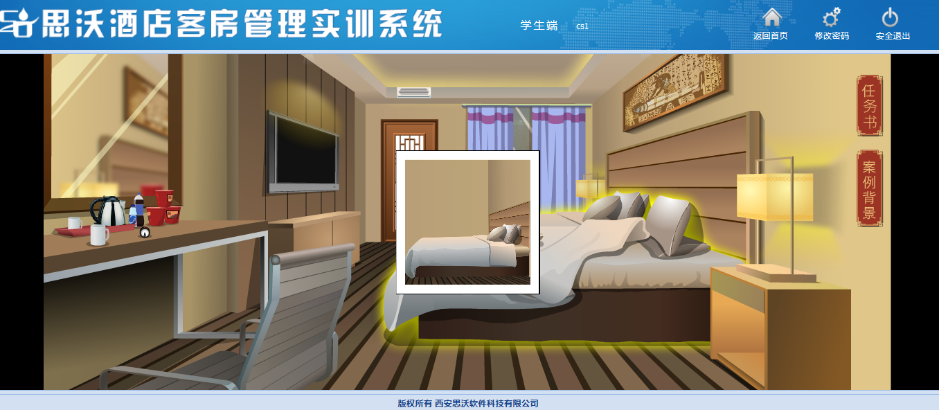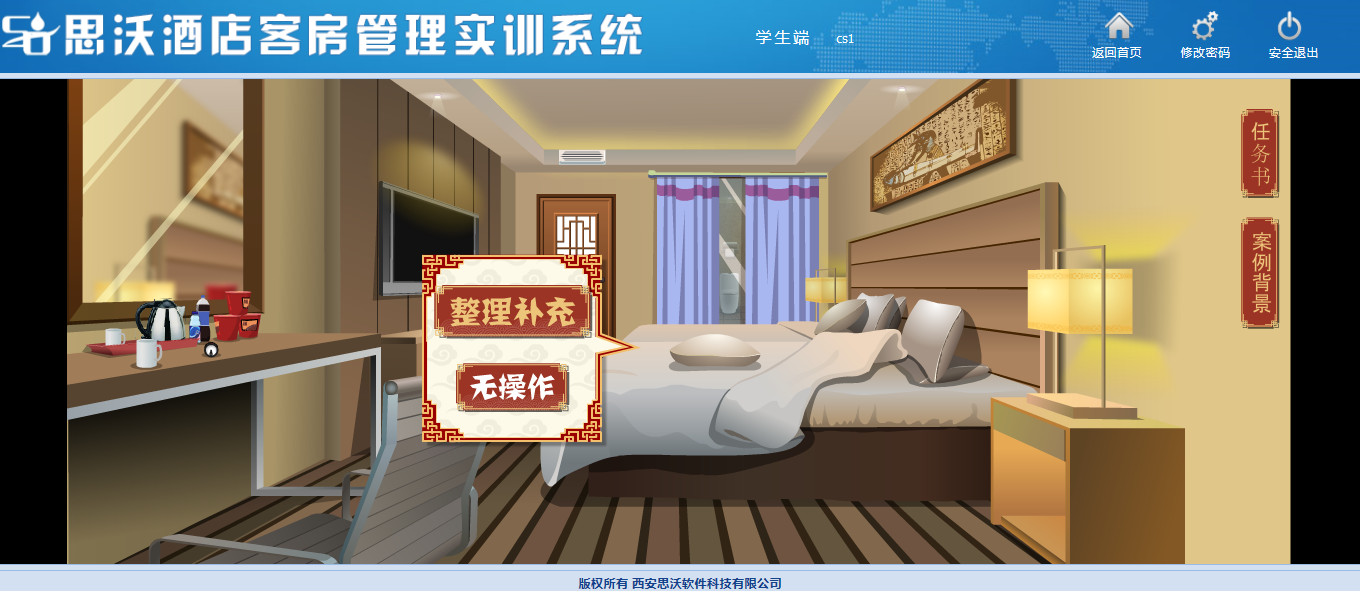 該教學軟件平(ping)臺模(mo)擬客房場景,學生(sheng)通(tong)過場景互動(dong)進(jin)(jin)行(xing)模(mo)擬操作(zuo),包含任(ren)務書、案例(li)背(bei)景等,學生(sheng)在操作(zuo)過程中(zhong)可(ke)隨時查看進(jin)(jin)度。學生(sheng)通(tong)過該教學軟件平(ping)臺的虛擬場景中(zhong)可(ke)對床上用品(pin)、窗簾、電器(qi)、桌椅(yi)、茶(cha)幾上的消費商品(pin)、洗漱臺、馬(ma)桶(tong)、浴(yu)室等進(jin)(jin)行(xing)整理操作(zuo)。