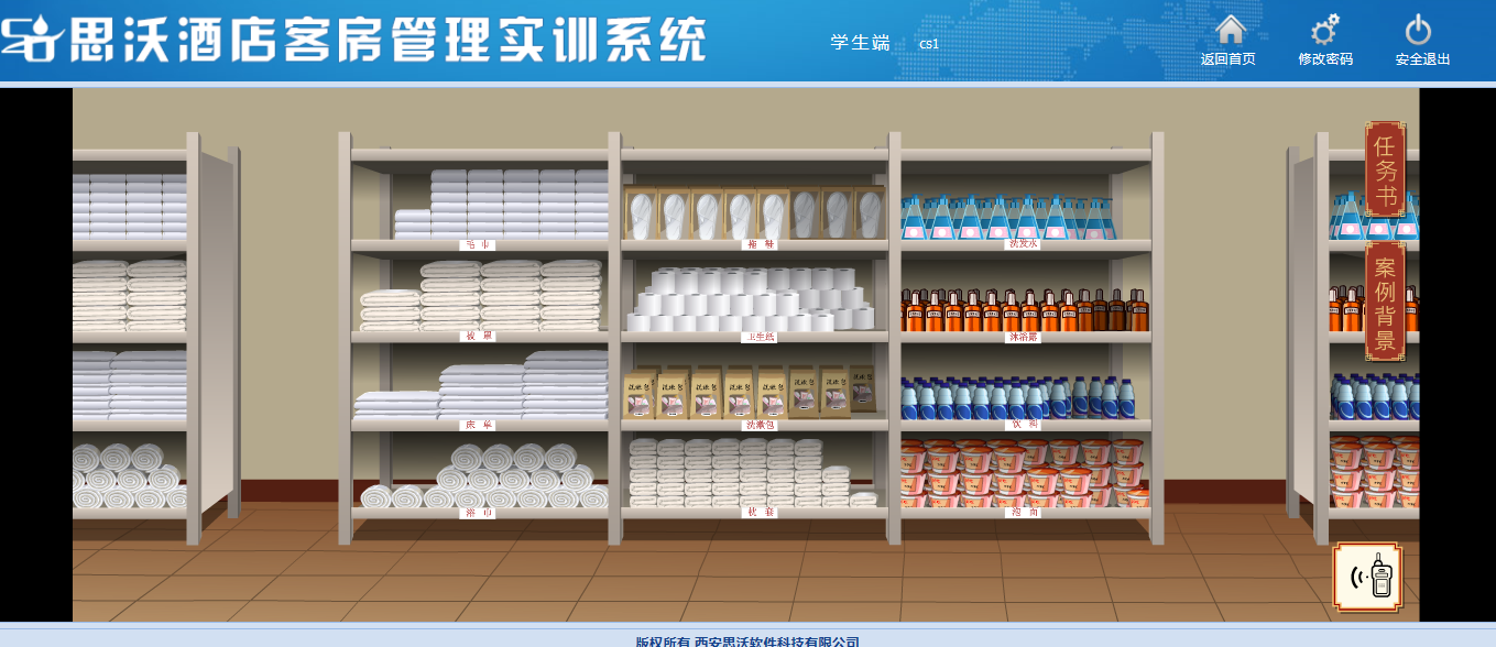 學生端(duan)包含(han)布草(cao)間(jian)管理場(chang)景模擬(ni),學生模擬(ni)工(gong)作(zuo)(zuo)人員(yuan)通過動畫(hua)場(chang)景互(hu)動對(dui)布草(cao)間(jian)進(jin)行管理操作(zuo)(zuo)。并可查(cha)看床單、被罩、枕套、浴巾、毛巾、洗(xi)漱(shu)包、洗(xi)發水等消耗物品的庫存數量,并判斷(duan)是否補充(chong)。
