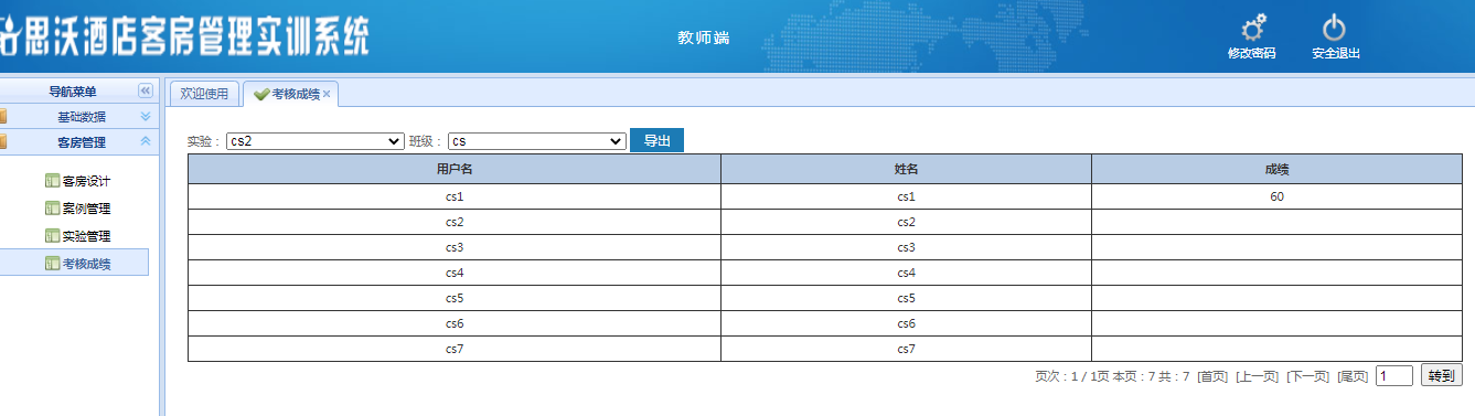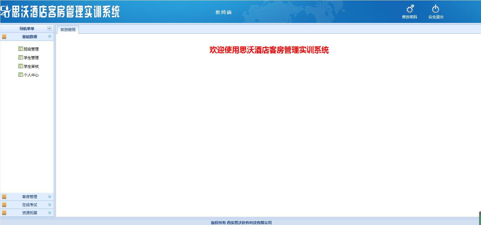 教師登陸界面:基礎數據、客房管理(li),在線考試,資源拓展每個(ge)大模塊(kuai)下分(fen)別有(you)相應(ying)的(de)子模塊(kuai)。