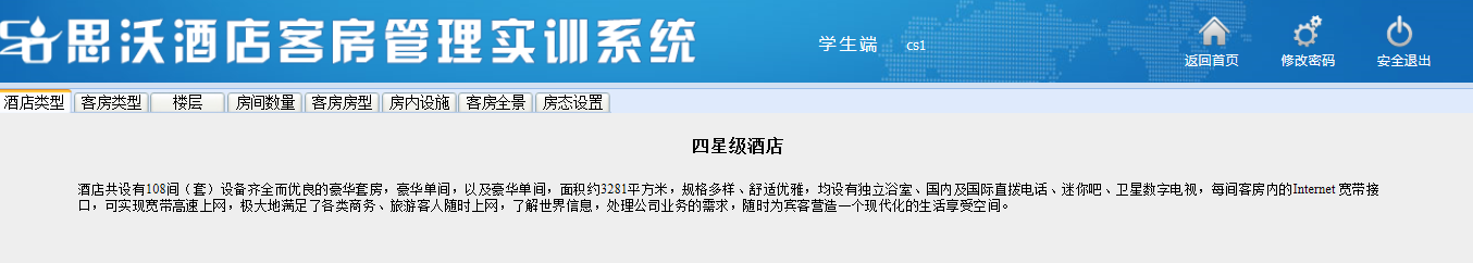 關鍵詞:思沃(wo)高校酒(jiu)店客(ke)房管理教(jiao)學實訓系統 酒(jiu)店客(ke)房管理實訓教(jiao)學軟件(jian) 酒(jiu)店客(ke)房管理實訓教(jiao)學平臺
