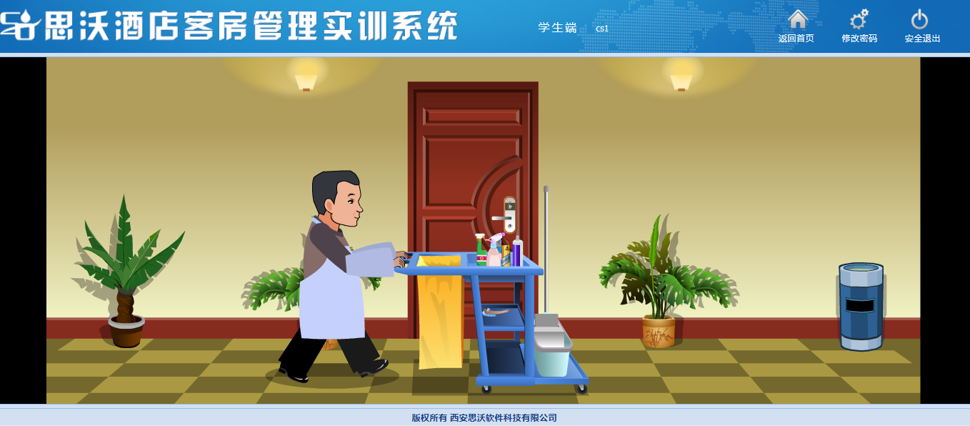 思沃酒店客(ke)房(fang)管(guan)理模(mo)擬(ni)(ni)實(shi)(shi)訓系統以flash動畫模(mo)擬(ni)(ni)酒店情景(jing),學生進(jin)入進(jin)行模(mo)擬(ni)(ni)客(ke)房(fang)管(guan)理日常(chang)事(shi)務(wu)處理,包括(kuo)客(ke)房(fang)設計、引領(ling)入住、客(ke)房(fang)查房(fang)、客(ke)房(fang)整理、布草間等類型實(shi)(shi)訓。