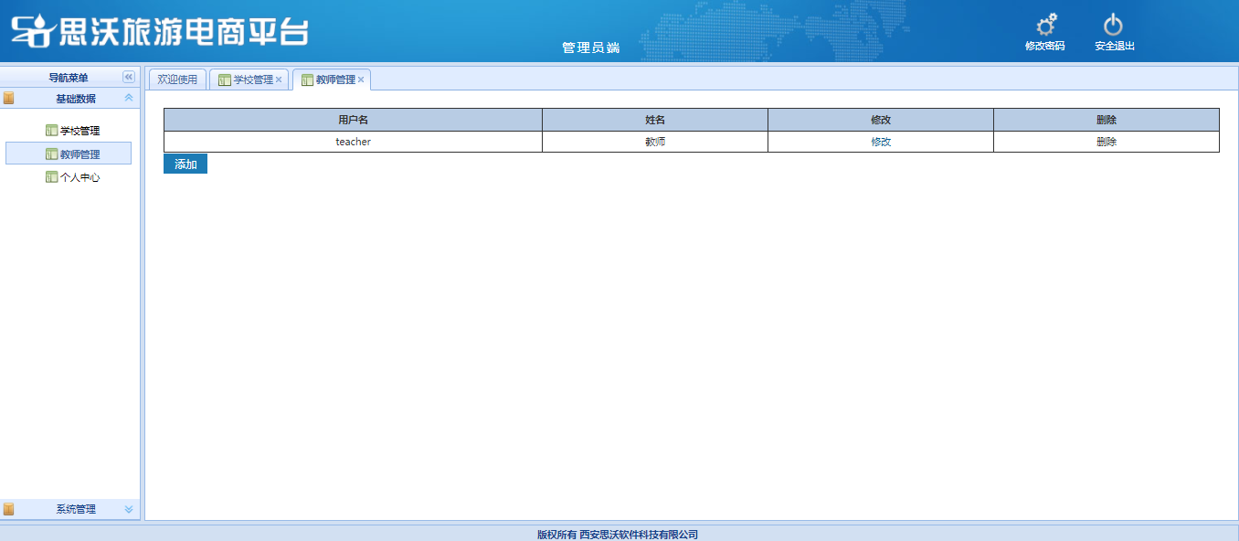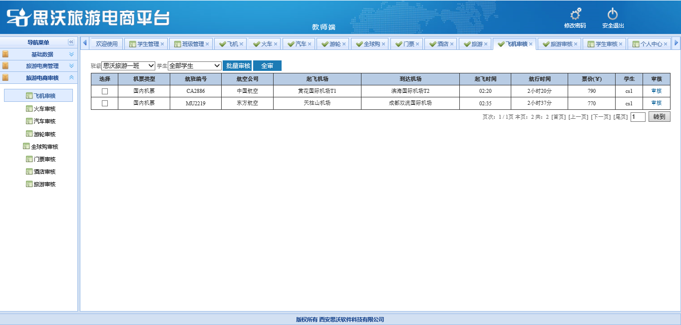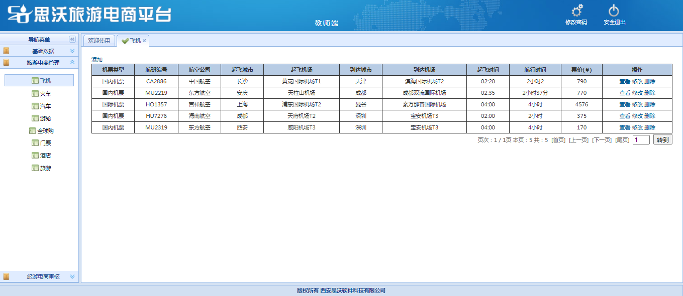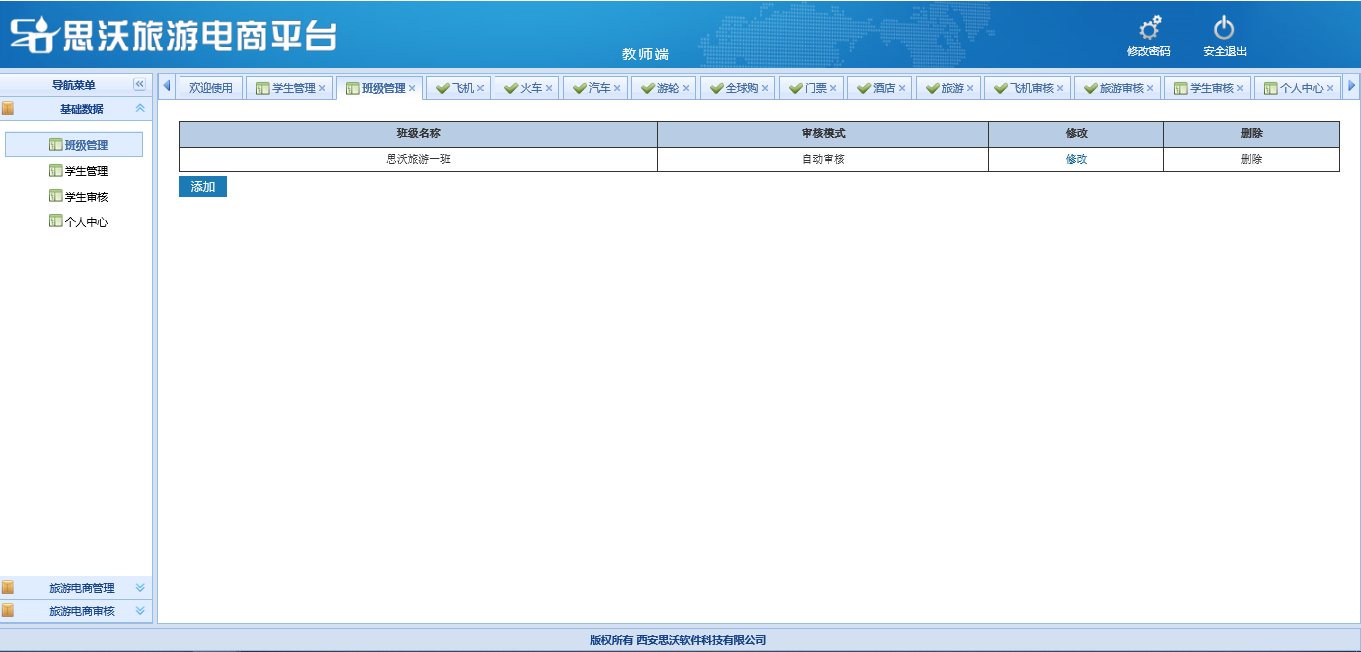 教師(shi)端包括:基礎數(shu)據(班級管理(li)(li)、學(xue)生(sheng)(sheng)管理(li)(li)、學(xue)生(sheng)(sheng)審(shen)核(he)、個(ge)人信(xin)(xin)息);旅(lv)(lv)游(you)(you)電商(shang)管理(li)(li)(對學(xue)生(sheng)(sheng)發布(bu)已審(shen)核(he)的飛(fei)機、火(huo)車、汽車、游(you)(you)輪、全球(qiu)購、門票、酒店(dian)、旅(lv)(lv)游(you)(you)產品信(xin)(xin)息進行管理(li)(li));旅(lv)(lv)游(you)(you)電商(shang)審(shen)核(he)(對學(xue)生(sheng)(sheng)發布(bu)的飛(fei)機、火(huo)車、汽車、游(you)(you)輪、全球(qiu)購、門票、酒店(dian)、旅(lv)(lv)游(you)(you)產品信(xin)(xin)息進行進行審(shen)核(he))。