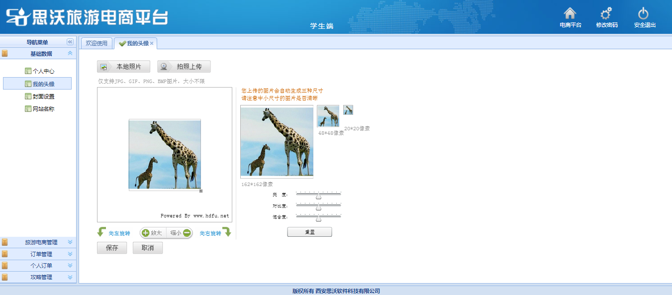 學生(sheng)后臺(tai)網(wang)站(zhan)(zhan)頁面個(ge)性(xing)化操作,可通過攝像頭等(deng)(deng)設(she)備進行(xing)頭像拍照上(shang)傳、也可上(shang)傳本地照片,行(xing)網(wang)站(zhan)(zhan)名(ming)稱及封(feng)面設(she)置。并進行(xing)飛(fei)機(ji)、火(huo)車、汽車、游(you)輪、全球購、門票、酒店(dian)、旅游(you)產品(pin)、旅游(you)攻略等(deng)(deng)信(xin)息添(tian)加發布。