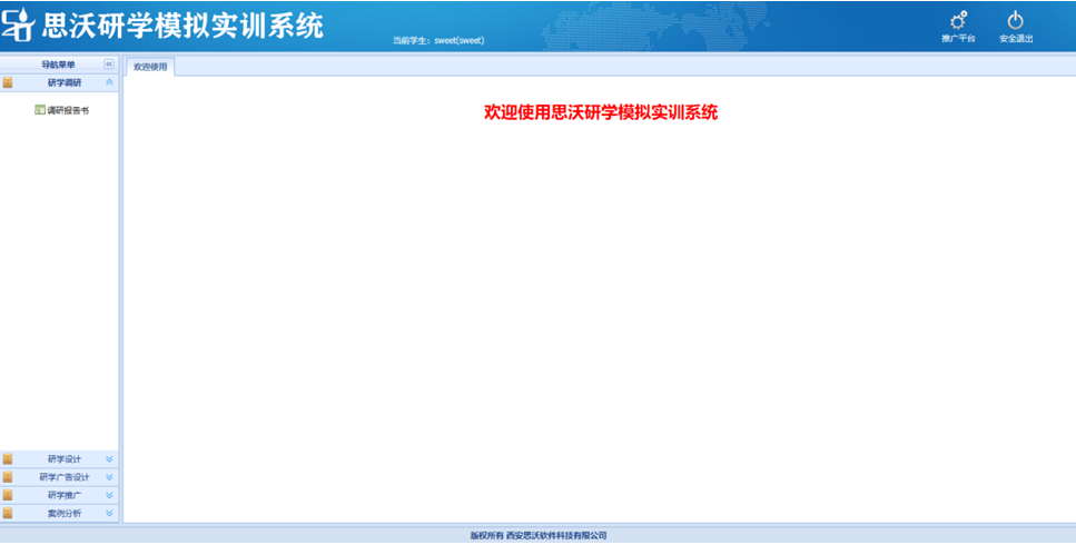 思沃研(yan)(yan)(yan)學(xue)(xue)(xue)模(mo)(mo)擬(ni)實訓(xun)系(xi)(xi)統分(fen)(fen)(fen)為管(guan)理員,教(jiao)師,學(xue)(xue)(xue)生(sheng)三種角色,功能(neng)包括推廣平臺、首頁,知(zhi)識庫,研(yan)(yan)(yan)學(xue)(xue)(xue)推廣,圖文結合廣告(gao),媒(mei)體推送廣告(gao),研(yan)(yan)(yan)學(xue)(xue)(xue)調研(yan)(yan)(yan),研(yan)(yan)(yan)學(xue)(xue)(xue)設(she)計(ji)等。學(xue)(xue)(xue)生(sheng)通(tong)過(guo)模(mo)(mo)擬(ni)實訓(xun)體驗從(cong)研(yan)(yan)(yan)學(xue)(xue)(xue)內(nei)容(rong)調研(yan)(yan)(yan)、研(yan)(yan)(yan)學(xue)(xue)(xue)路(lu)線設(she)計(ji)、研(yan)(yan)(yan)學(xue)(xue)(xue)核心價值發掘、研(yan)(yan)(yan)學(xue)(xue)(xue)媒(mei)體網絡推廣等一系(xi)(xi)列(lie)工作內(nei)容(rong)。 研(yan)(yan)(yan)學(xue)(xue)(xue)軟件包含案例分(fen)(fen)(fen)析,點(dian)(dian)評,研(yan)(yan)(yan)學(xue)(xue)(xue)線路(lu)設(she)計(ji),團隊類(lei)(lei)(lei)型(xing)(xing),機型(xing)(xing),小交(jiao)通(tong)標準,出入境口岸,匯(hui)率維護,酒(jiu)店類(lei)(lei)(lei)型(xing)(xing),研(yan)(yan)(yan)學(xue)(xue)(xue)類(lei)(lei)(lei)型(xing)(xing)知(zhi)識庫類(lei)(lei)(lei)型(xing)(xing),案例類(lei)(lei)(lei)型(xing)(xing),航(hang)空公司(si),線路(lu)區(qu)域,團隊等級(ji),住宿(su)標準,大交(jiao)通(tong)標準,門票(piao)標準,餐飲標準,導游證(zheng)類(lei)(lei)(lei)別(bie),酒(jiu)店等級(ji),客戶行業分(fen)(fen)(fen)類(lei)(lei)(lei),客戶等級(ji)分(fen)(fen)(fen)類(lei)(lei)(lei),客戶關系(xi)(xi)深度,地接(jie)(jie)車等級(ji),客戶接(jie)(jie)受程度,國家(jia)維護,省份維護,城市(shi)維護,景點(dian)(dian)類(lei)(lei)(lei)型(xing)(xing),學(xue)(xue)(xue)生(sheng)可(ke)以進行系(xi)(xi)統的模(mo)(mo)擬(ni)學(xue)(xue)(xue)習。