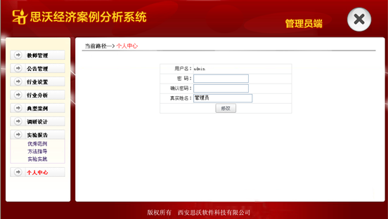 管(guan)(guan)理員端是主要進行系統的基礎數(shu)據(ju)管(guan)(guan)理和(he)設(she)置(zhi)的,其中(zhong)主要包(bao)括教師管(guan)(guan)理、公告管(guan)(guan)理、行業(ye)設(she)置(zhi)、行業(ye)分析、典(dian)型案例、調(diao)研設(she)計、實驗報告、個(ge)人(ren)中(zhong)心(xin)等主要模塊(kuai)。
